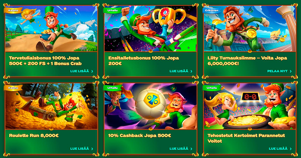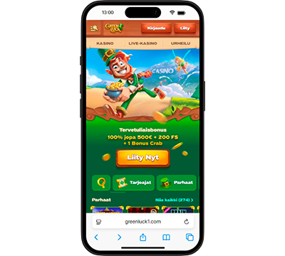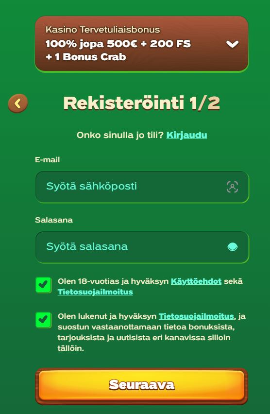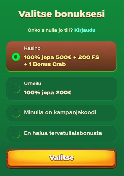 Kyllä, kasino tarjoaa ensitalletukselle 100 % bonusta 500 euroon asti, 200 ilmaiskierrosta ja 1 Bonus Crabin. Saat lunastettua tämän tarjouksen ilman GreenLuck promokoodia yksinkertaisesti valitsemalla tämän tervetuliaispaketin rekisteröitymisen yhteydessä. -