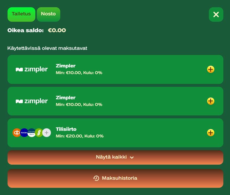 | Talletustavat | Tilisiirto, verkkopankkimaksu, Skrill, Neteller, Jeton, MiFinity, Siru Mobile, Mastercard, kryptovaluuttalompakot |